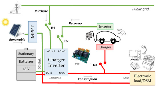 The micro-grid under study, comprising a photovoltaic system with storage, an electric vehicle, and a Demand-Side Management (DSM) system reproduced by a programmable electronic load. In the middle, a relay board controls R1, R2, and R3.
