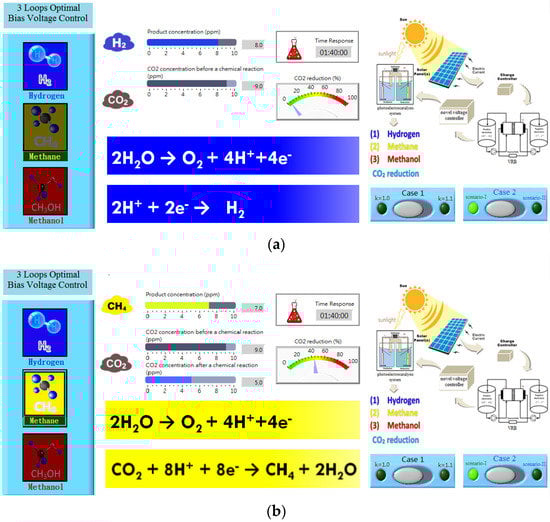 The electrochemical reduction of CO2 requires electrical energy, with overpotential always >1 V (vs. standard hydrogen electrode (SHE) or normal hydrogen electrode (NHE)) to get reasonable amounts of fuels [26,30]. A concept of an integrated energy carrier includes electricity plus hydrogen and synthetic carbon-based fuels. Therefore, we design a novel voltage controller (NVC) to switch three different loop reactions, and use only electrochemical potentials to drive the reaction to run the hydrogen production (Loop-01: V01-k1V01 vs NHE) and conversion of carbon dioxide into methane (Loop-02: V02-k2V02 vs NHE) and methanol (Loop-03: V03-k3V03 vs NHE), as shown in Figure 4. It facilitates the combination of the different potentials.