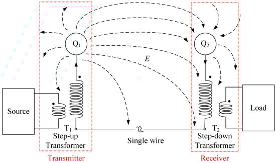 In general, single-wire ECPT systems mainly contain a source, transmitter, receiver, and load, as shown in Figure 1. The source is usually achieved by a converter, such as half-bridge, full-bridge, and others, which serves as power supply for the whole system. The transmitter includes a step-up transformer T1 and a metal conductor Q1 that obtains the power from the source and transfers it to the receiver through coupling electric field. The receiver comprises a metal conductor Q2 and step-down transformer T2 that provides power for a resistant load. Particularly, the coupling capacitance between Q1 and Q2 can be expressed as when both Q1 and Q2 are spherical metal conductors of radius r, is the permittivity of vacuum.