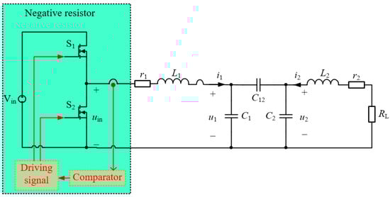 As illustrated in Figure 1, the transformer T1 on the transmitting side only plays a role in boosting the input voltage, similarly, the transformer T2 on the receiving side only serves to reduce the output voltage, the source reflected to the high-voltage coil on the transmitting side is proportional to the original voltage source or current source, and the load reflected to the low-voltage coil on the receiving side is also proportional to the actual load. Thus, the system shown in Figure 1 can be simplified to a two-coil equivalent circuit, as shown in Figure 2, it is a detailed schematic of the entire single-wire ECPT system based on the nonlinear PT model, which includes a half-bridge converter, coil inductance L1 and L2, internal resistance r1 and r2, parasitic capacitance C1 and C2, coupling capacitor C12, and load resistance RL. It is important to note that the half-bridge converter is used to realize a negative resistor with the characteristics of high power nonlinear gain saturation, thus attaining a PT-symmetric mode of the entire single-wire ECPT system. Besides, the implementation of the negative resistor is not limited to half-bridge converter.