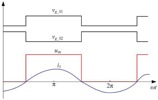 Equation (1) can be solved immediately when uin is given. Figure 3 shows the waveform of uin at two different operation cases, as well as i1 and the gate drive signals of S1 and S2 (vg_S1 and vg_S2). To simplify the analysis, the delay time and dead time is not considered in modeling. As shown in Figure 3, the voltage uin depends on current waveform i1 across the LC (inductance and capacitance) tank of the transmitter [29]. Therefore, assuming the direction of current i1 shown in Figure 2 is positive, uin is defined as