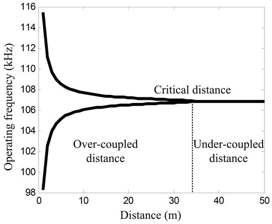 Theoretical values of the operating frequency. The critical distance is about 34 m, which is far greater than the transmission distance of the typical WPT system.