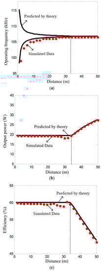 Calculated and simulated values of operating frequency, output power, and transmission efficiency as a function of distance between transmitter and receiver, the black solid line is the theoretical values derived from the equations of system, the red solid point is the simulated values by the circuit simulation: (a) operating frequency versus distance; (b) output power versus distance; (c) efficiency versus distance.
