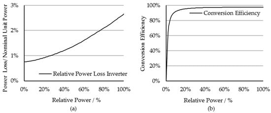 Power losses in a bidirectional inverter: (a) power losses over relative power; and (b) conversion energy efficiency over relative power. Data from [7].