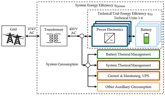The calculation boundaries of the round-trip technical unit energy efficiency , which includes the battery and the power electronics, as well as for the overall round-trip system energy efficiency , which further includes the transformer and the auxiliary system consumption, are also indicated in Figure 2.
