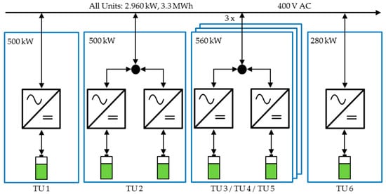 Figure 3 shows a detailed overview of the TU with their varying specifications and setups. TU 2–5 each consist of two identical power strings. Both power strings each provide half of the nominal power/energy of the TU. TU 3–5 are identical and shown only once.