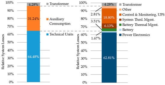 The right side shows the analysis with a more detailed breakdown. Within the TU, the PE is identified as the largest contributor, whereas the batteries are the smallest contributor of all loss mechanisms. The breakdown of the auxiliary consumption shows that all components are relevant contributors. The Control and Monitoring of the overall system, which also includes the power consumption of the uninterruptible power supply, is the biggest contributor to the auxiliary consumption and the second-largest in overall. It is noted that the energy consumption of the thermal management is subject to changes with varying outdoor temperatures and that this analysis specifically covers March 2017 only.