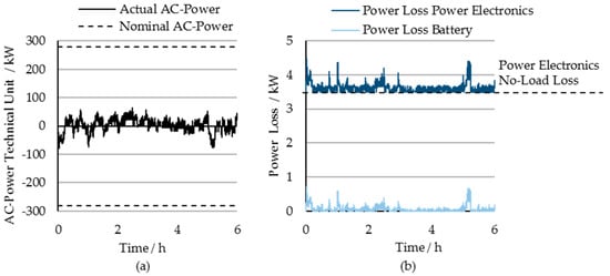 Time series analysis for load profile and power loss for a single Technical Unit (TU 6) during an arbitrary six-hour timeframe: (a) measured AC-power (: Charge, : Discharge); and (b) simulated power losses in power electronics and battery.