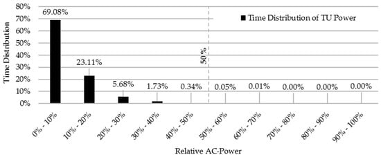 Most of the time, the power is low: 99.95% of the time, the relative power is under 50%. As TU 3–5 consist of two power strings of identical setup, during this time, theoretically, only a single power string would be sufficient for providing the output power. This result motivates the development of an optimized PFDS that uses this optimization potential.