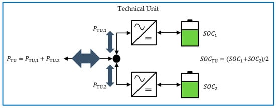 The two battery SOC values, and , and the corresponding average SOC for the unit , are also shown.