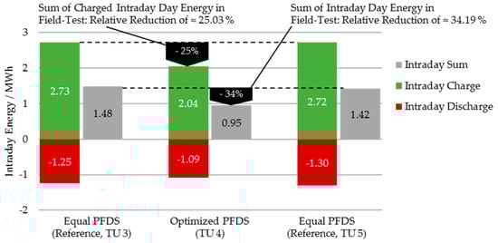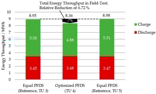The analysis of the charge/discharge energy throughput is shown in Figure 9 for TU 3–5 for the period 3–14 August 2017. The overall discharged energy is identical across all units. However, the charged energy shows a reduction from 5.50/5.51 MWh (TU 3/TU 5) to 4.88 MWh, concluding that the increased energy efficiency is a consequence of a reduced energy input. The reduction of the total energy throughput from 8.95/8.98 MWh (TU 3/TU 5) by 6.72% to 8.36 MWh (TU 4) consequently also leads to a reduced charge throughput for the battery pack in TU 4, resulting in fewer battery cycles.