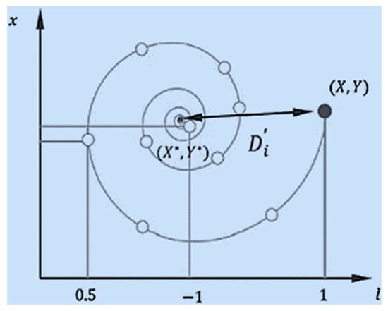 where, denotes the distance between the whale and the best prey. is a constant, while . The logarithmic spiral updating equation is clarified by Figure 4.