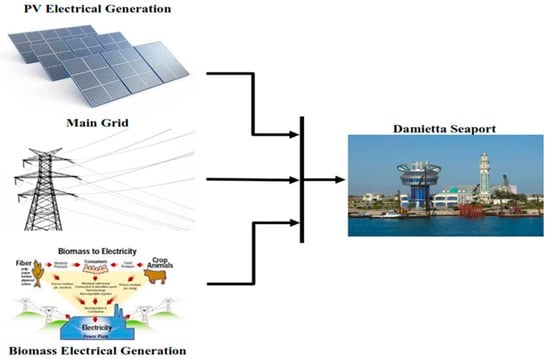 Different electrical power sources that feed the Damietta seaport (the grid and suggested renewable energy sources).