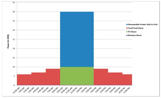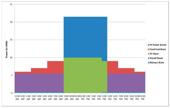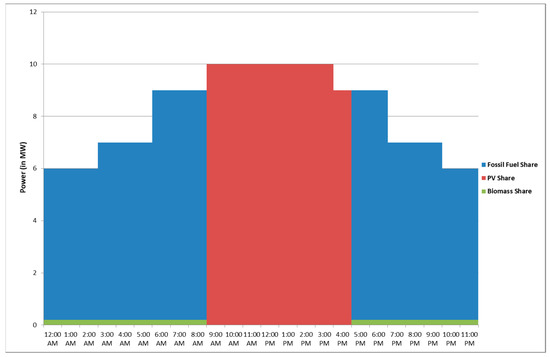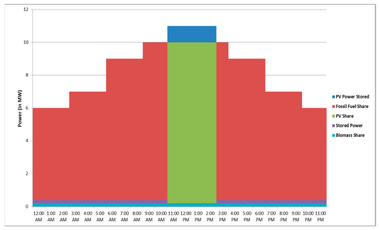 where, and denote the power share coefficient of fossil fuel, PV and biomass electrical energy generation respectively. and indicate the generation duration of fossil fuel, PV and biomass electrical energy (in hours) respectively. The maximum available electrical generated power (in kW) from fossil fuel, PV and biomass are referred as and respectively. Referring to Equations (2) and (3), is directly proportional with the total solar panel area ( in m2). The system optimized variables are , , and