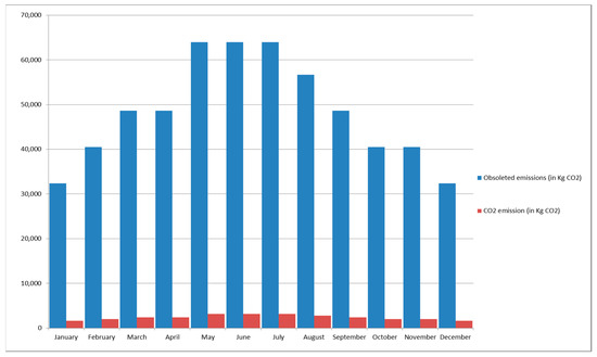 The average daily PV electrical energy generation and the average PV CO2 emission (in kg CO2) compared to the obsoleted CO2 emission (in kg CO2) for both scenarios “with and without storage battery unit” of IRWOTS calculated in Table 11. Figure 16 and Figure 17 clarify the average PV CO2 emission (in kg CO2) compared to the obsoleted CO2 emission (in kg CO2) for both scenarios.