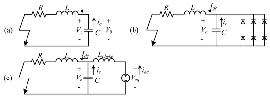 The equivalent circuits of different stages: (a) Stage 1: Capacitor discharge; (b) Stage 2: Diodes freewheel; and (c) Stage 3: Grid current feeding.