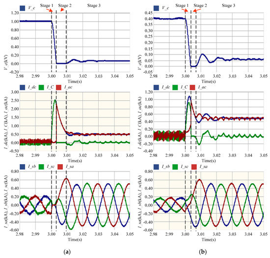 The electrical waveforms of different stages: (a) The waveforms in the HVDC system: DC-side voltage V_c (in kV), DC-side current I_dc (in kA), capacitor current I_C (in kA), AC-side feeding current I_ac (in kA), and AC-side three-phase current I_sa,b,c (in kA); (b) The waveforms in the LVDC system: DC-side voltage V_c (in kV), DC-side current I_dc (in kA), capacitor current I_C (in kA), AC-side feeding current I_ac (in kA), and AC-side three-phase current I_sa,b,c (in kA).