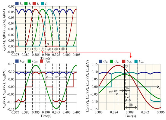 During the steady-state process, all freewheel diodes conduct for half of a primitive period, which is different from the situation observed in a three-phase rectification circuit (freewheel diodes conduct for one third of a primitive period). This finding is attributable to the freewheel effect of the AC-side inductance when the AC voltage Uabc is lower than the DC voltage Udc. However, when the current of the AC-side inductance decreases to 0 (point A in Figure 4), the freewheel diodes prevent the current from decreasing further. Therefore, the rate of change in the current of the AC-side inductance di1/dt abruptly changes to 0, which results in Uabl = Uabs < Udc, with the result that diode 1 is blocking and diode 4 is conducting. Note that each diode conducts for less than half of a primitive period when .