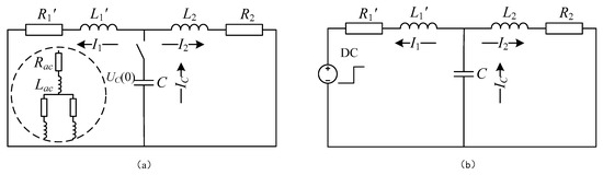 Figure 5a is the circuit representing the natural response process. and are the equivalent parameters of the AC-side components. Two of the three-phase branches are always in parallel connection, connected with the remaining branch in series (circuit structure in Figure 4a). Thus, consider and to be equal to and , respectively. and are the total parameters of the DC-side components. is the parameter of DC-linked capacitance. The DC-linked capacitance discharges to each branch at the voltage of the operating value, . Figure 5b depicts the circuit representing the forced response process. Considering that the DC source is connected to the circuit at the moment of fault occurrence, the magnitude of the source can be equal to the step signal, the amplitude of which is derived from the output voltage of three-phase full-wave bridge circuit .