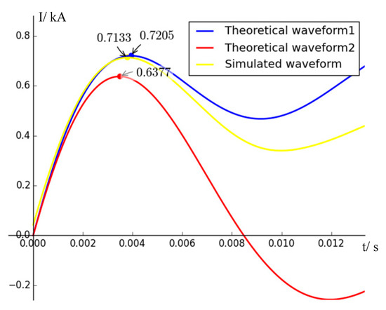 Figure 7 shows the comparison between the theoretical waveform1 obtained by Equation (24), theoretical waveform2 obtained by formulas in [4] and the simulated waveform of the surge current, with a metal short-circuit fault occurring on 2 km of the whole cable. As the figure shows, nearly no errors are observed between the theoretical waveform1 and simulated waveform when the fault occurs with no resistance. However, considerable errors appear between the theoretical waveform2 and simulated waveform. The theoretical value is much lower than the simulated value, as the forced response from AC-side is omitted.