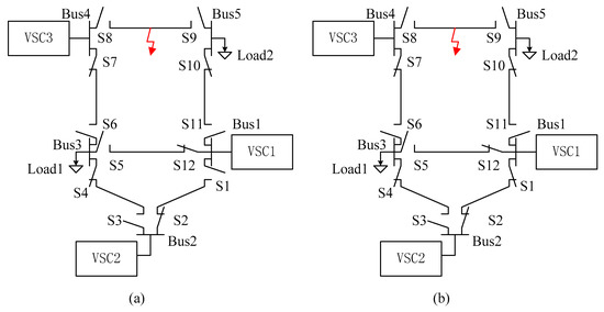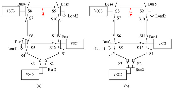 The criterion to block the switch operation instructions is , where is the minimal length of cables connected to active bus, and is the fault distance calculated by the method proposed in Section 4.1. For instance, the same fault occurs in the DC system, and the peak currents of VSC are , and , respectively. According to Equations (26) and (27), the distances of the fault to VSC1, VSC2 and VSC3 are 1.45 km, 2.01 km and 0.63 km, respectively (Data in detail are given in appendices). According to step p2, the operation instructions of switches connected to Bus1 and Bus2 should be blocked. Thus, S1, S2, S3, S11 and S12 will not be opened or re-closed until the last step. The remaining switches S6, S8 and S9 will be opened according to step 2 (Figure 10a), and only S6 will be reclosed according to step 4 (Figure 10b).