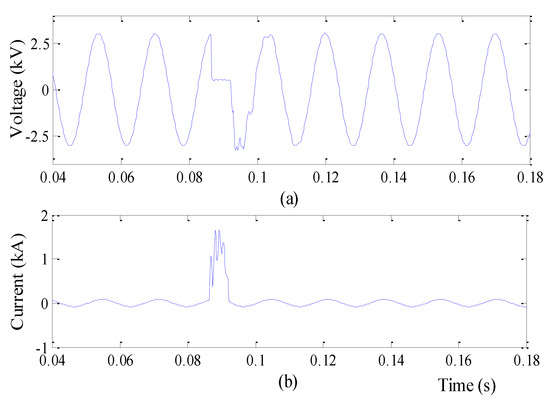 Sub-cycle incipient fault (IF) event at fault location: (a) voltage; (b) current.