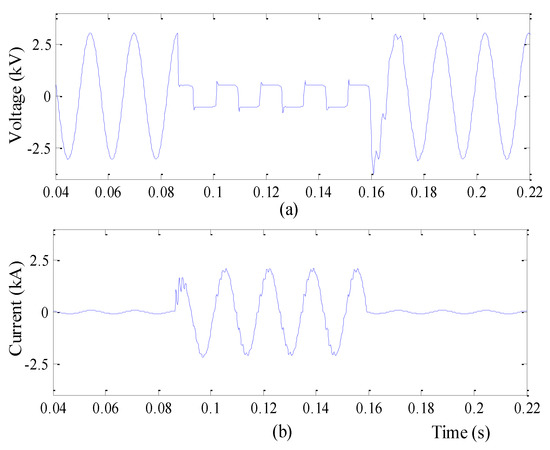 Multi-cycle incipient fault (IF) event at fault location: (a) voltage; (b) current.