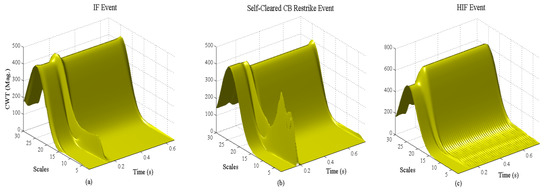 To identify the scale parameters, all types of events are tested and a few are shown in Figure 4. All events are seen to excite the 24th scale the most, which represents the power frequency (e.g., 1440 Hz/24 = 60 Hz). However, as it is seen in Figure 4, this scale is not well localized in time and, therefore, distinguishing the inception time becomes more ambiguous. Furthermore, the data length must be increased to overcome the edge effects. On the contrary, low scales such as the 8 and 4.8 scales that represent the 3rd and 5th harmonics, respectively, which are also excited by all events, are more time localized (as seen in Figure 4), hence, they will require fewer data for detection. The 8th scale is more suitable as it is excited more in case of HIF events due to the high presence of the 3rd harmonic. Hence, only this scale was used for detection of all events in order to keep the number of scales minimal.