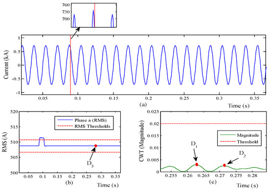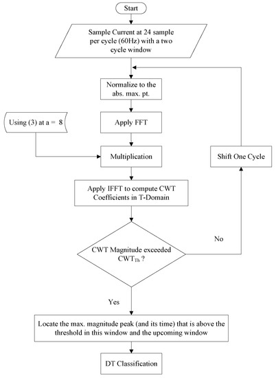where and are set to 2 and 1, respectively. Subsequently, the FFT of the neutral current signal is computed and multiplied by Equation (3) to obtain the CWT in the frequency domain. Then, the inverse FFT is applied to obtain the CWT in the time domain, as in Equation (1). Finally, the detection process is applied according to the flowchart illustrated in Figure 5.