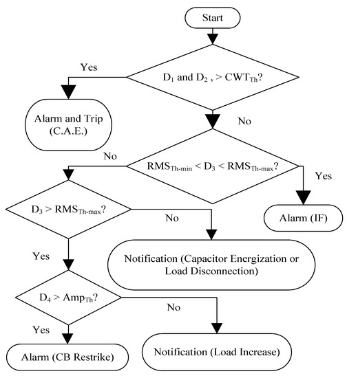The classification algorithm uses a DT that utilizes the neutral current, the three phase currents and the supervisory control and data acquisition (SCADA) information. The main signatures of the aforementioned events can be distinguished as continuous arcing events (C.A.E.), non-continuous arcing events (N.C.A.E.) and normal operations events (N.Op.). The C.A.E. include permanent faults, HIFs and failed CB during capacitor de-energization. The N.C.A.E. include the IFs and self-cleared CB restrikes during capacitor de-energization, while the N.Op. include capacitor energization and load switching. The current signals are used to classify the detected events into general classes of C.A.E., N.C.A.E. and N.Op. The SCADA information is applied with the DT general classification to precisely identify the type of the event from the above classes. The required four inputs for the DT general classification are: