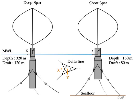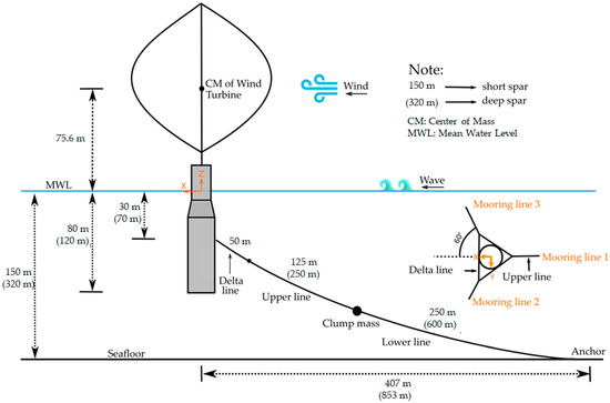 The catenary mooring system is used for both the short and deep spar VAWTs. The main purpose of the mooring system is to maintain the floater in the proper position, and the delta line can provide yaw stiffness. For a conservative design approach, the turbulent wind and irregular wave are aligned in the same direction (+X global motion) in this study; hence, Mooring Line 1 will have the main role in withstanding most of the external force (