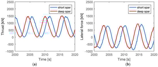 Figure 6. Generally, the amplitudes of thrust and lateral force are similar. The mean value of lateral force is approximately zero, but the thrust fluctuates between zero and double the mean value. In addition, the amplitude of the short spar VAWT is almost the same as that of the deep spar VAWT in both thrust and lateral force, but the phase among these two spars is different. The average periods of thrust and lateral force are each around 6 s, which correspond to the 2P frequency.