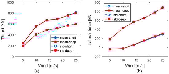 Figure 7 displays the statistical comparisons of the thrust and lateral force for both spars under all loading cases. For simplicity, the results are plotted with the mean wind speed only even the loading includes the turbulent wind and irregular wave simultaneously. Both the comparisons indicate a good agreement between the short spar and deep spar. The mean values and standard deviations of the thrust and lateral force increase separately as the wind speed increases.