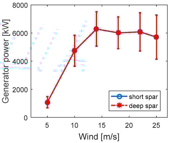 Figure 8. This power curve shows the mean generator power production with the error bar indicating the standard deviations of the mean values. The short spar curve has a good agreement with the deep spar performance. The power production of both the short and deep spar VAWTs increases as the wind speed increases. While the wind speed exceeds the rated speed (14 m/s), the mean power production will be higher than 5 MW but remain approximately a constant value. The cause of this fact is that a PI-based generator torque controller is implemented to maintain an approximately constant generator power when the rated operation point is reached [