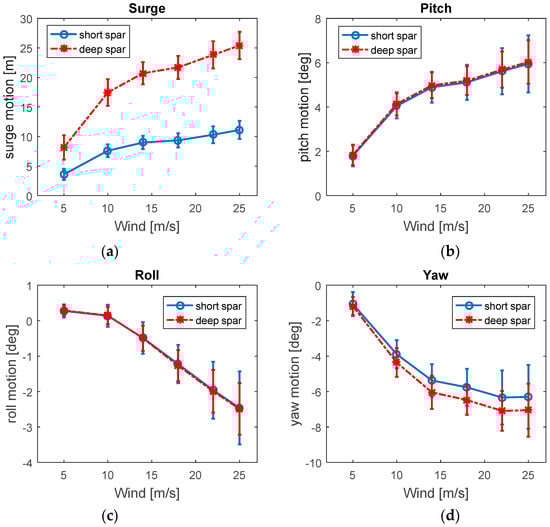 Figure 2). The comparisons of the mean values and standard deviations of the global motions under different environmental conditions between the short and deep spar VAWTs are shown in