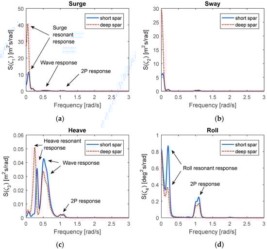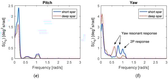 In surge and sway motion, the deep spar VAWT has much larger resonant response. Typically, the dynamic response is determined through mass of inertia, damping, and stiffness of the system. The viscous damping terms were considered in both spar VAWT models. Owning to less discrepancy between the added mass of both spar VAWTs in surge/sway, the stiffness term becomes the key factor. Since the longer mooring lines of the deep spar VAWT result in softer restoring stiffness in the horizontal direction, a larger spectrum of surge/sway motions occur. In addition, the dominating spectra values of the short spar VAWT in roll, pitch, and yaw motion are larger than those of the deep spar VAWT. Due to a shorter metacenter height and softer restoring stiffness in roll/pitch, the higher standard deviations and larger spectrum values in roll/pitch motion could be expected from the short spar VAWT.