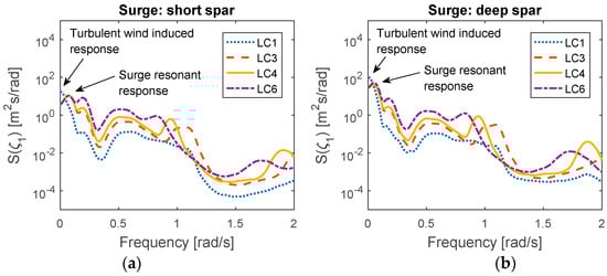 The power spectra of the short and deep spar VAWTs in surge under each environmental loading are plotted in