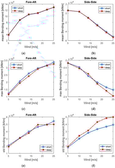Figure 12 compares the respective mean values, maxima values, and the standard deviations of fore–aft and side–side bending moments for the short and deep spar VAWTs. In this study, the maximum value in each loading case was derived from the mean of maximal numbers for each random seed simulation in the time domain. Overall, the comparison shows a good agreement between the short spar and deep spar. The mean, maximum, and standard deviations of the bending moment in both fore–aft and side–side directions increase as wind velocity increases.