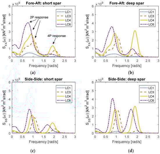 Figure 13. Whether in the short spar VAWT or the deep spar VAWT, 2P responses are almost dominating for all loading conditions. The response at 4P frequency will become significant when the wind speed is over the rated speed (LC4 to LC6). The excitation may result from the structural resonance at 4P frequency when the environmental condition exceeds loading case LC3. The corresponding maxima spectra values for each loading case increase as wind velocity increases. The 2P responses of the deep spar VAWT in the tower base side–side bending moment are larger than those of the short spar VAWT, as are 2P responses in the tower base fore–aft bending moment for most loading cases. An exception is LC6 with U