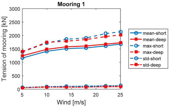 Figure 14 presents the mean values, maxima values, and standard deviations of Mooring Line 1 for the short and deep spar VAWTs under all environmental conditions. Generally, the mean, maxima values, and standard deviations increase as the wind speed and significant wave height increase. The mean values of tension for the deep spar VAWT are larger than those of the short spar VAWT, but the maxima values and standard deviations of the deep spar VAWT are smaller.