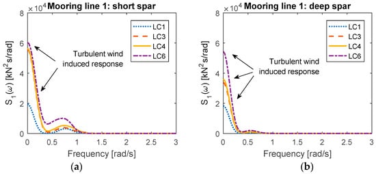 Figure 15 compares the respective spectra of tension in Mooring Line 1 between the short spar and deep spar VAWTs under all the loading cases. Overall, the distribution of tension spectra in Mooring Line 1 for the short spar VAWT agrees well with that of the deep spar VAWT. The similarity between the short and deep spar VAWTs in the tension spectra is that the dominating wind-induced response increases as the wind speed and irregular wave state increase. However, the dominating spectra values of the short spar VAWT are significantly higher, as are the standard deviations of the tension of Mooring Line 1.