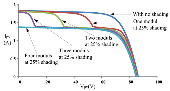 Current–voltage (I–V) curves of the 4-series 1-parallel array when different numbers of modules were at 25% shading.