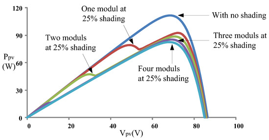 Power–voltage (P–V) curves of the 4-series 1-parallel array when different numbers of modules were at 25% shading.