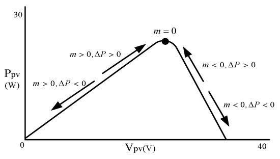 Slope (m) and changes in power () of the P–V characteristic curve determined through the power feedback method.