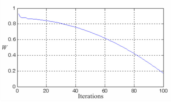 Trends of the weighting value (W) of the modified particle swarm optimization (PSO).