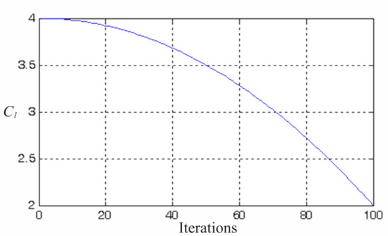 Regarding the learning factors, Equation (6) decreases the cognition learning factor C1 as the iteration number increases, indicating that reference to individual optimal locations is reduced with increasing iteration number. By contrast, Equation (7) increases the social learning factor C2 as the iteration number increases, indicating that reliance on the global optimal location is increased with increasing iteration number. Accordingly, the trends of the learning factors are displayed as in Figure 5 and Figure 6. Figure 7 illustrates the flowchart of the modified PSO algorithm. In this study, to ensure that the configured parameters of the modified PSO are not overly similar to those of the conventional PSO (Table 2) and thus affecting subsequent experimental interpretations, the upper limits of the weighting value, cognition learning factor, and social learning factor of the modified PSO were at least twice the values of the lower limits (Table 3).