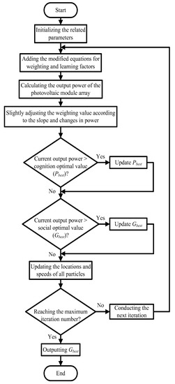 The PSO algorithm proposed in this study involves modifying the weighting of the conventional PSO. Specifically, Equation (3) is used to adjust the basic weighting and apply larger particle movements during the early iterations; this enables transcending of regional optimal solutions. However, as the number of iterations increases, the particles begin to closely approximate the global maximum power point; hence, the particle movement is reduced during this period to accurately track the global maximum power point.