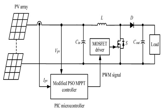 Figure 8 illustrates the framework of the maximum power point tracker of the modified PSO proposed in this study. The system includes a photovoltaic array arranged using Sanyo (Moriguchi, Osaka, Japan) HIP2717 modules [23], the PIC18F8720 microcontroller (R2004, Microchip Technology, Chandler, AZ, USA) [24], and a boost converter [25]. The modified PSO is used to control the duty cycle of the boost converter, thus identifying the global maximum power point of the module array. In particular, the tracking efficiency of this method is highlighted when the module array is shaded. Table 4 lists the parameter values of each component in the boost converter circuit. Table 5 lists the specifications of the HIP2717 module.
