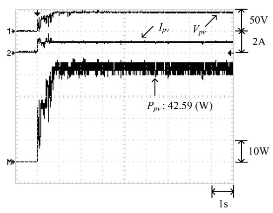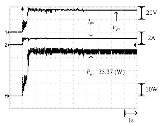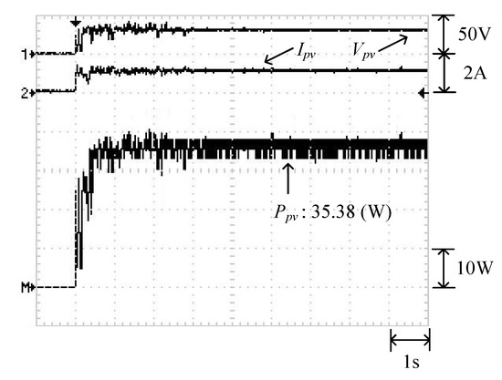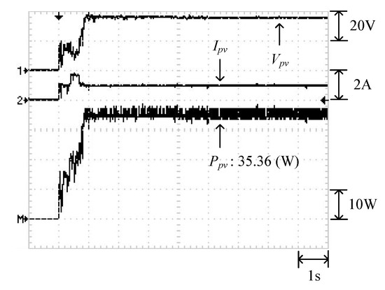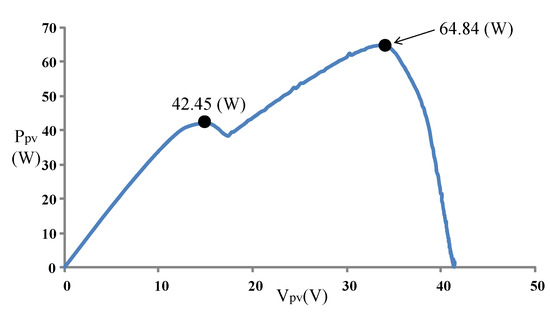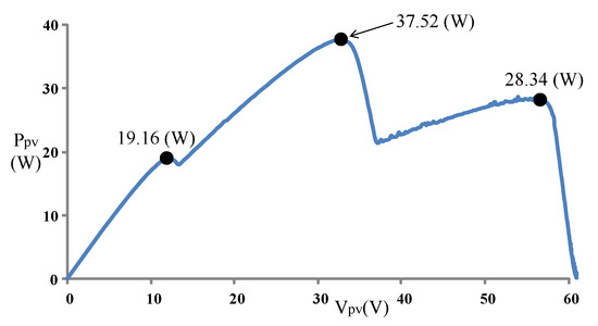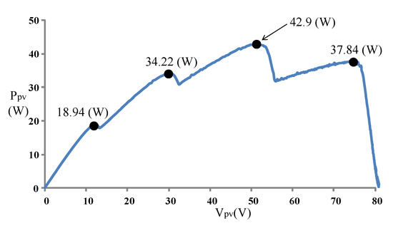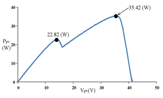 Figure 9 displays the P–V characteristic curve of Case 1 measured using MP-170. The curve exhibits two peaks, and the global maximum power point is located on the right peak (35.42 W). Figure 10 and Figure 11 illustrate the results obtained through the conventional and modified PSO algorithms, respectively. Comparing Figure 10 and Figure 11 revealed that the conventional PSO algorithm required more time to track the global maximum power point than the modified PSO algorithm.
