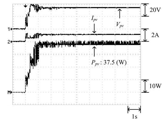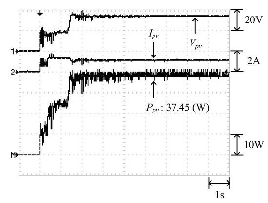Figure 12 illustrates the P–V characteristic curve of Case 2. The curve demonstrates three peaks, with the global maximum power point located on the middle peak (37.52 W). Figure 13 and Figure 14 display the results obtained through the conventional and modified PSO algorithms, respectively. Observing these two figures showed that when the conventional PSO algorithm was used, additional time was required to transcend the regional solutions and track the global maximum power point (37.45 W). By contrast, the modified PSO algorithm required less time to transcend the regional solutions and accurately track the maximum power point (37.5 W).